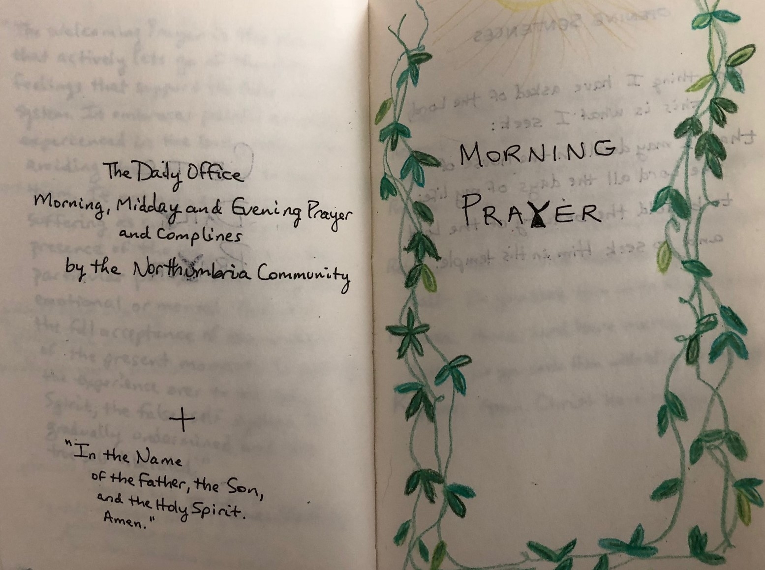 More recently, I customized the daily meditation and Scripture reading sections from Celtic Daily Prayer, but basically, I just compiled a bunch of stuff and sifted through it and copied it all down in a black Moleskine. I used it for about a year and then I lost it, and only afterward did I realize that I never made a copy. So I started over. I resifted everything and re-copied it into a grey pocket-sized Moleskine notebook — the unlined kind, as I’m not a fan of lined paper. Then, after my friend Amy Jo taught me how to quick-draw vines on a page, I added vines and a few other artistic elements to the cover and inside pages. (I watched a YouTube video to learn how to draw a loaf of bread, and I’m particularly proud of it.) I’ve since created a newer version in a thicker black, soft-cover Moleskine, and I’m still adding stuff to it. Here are a few snapshots of what it looks like: