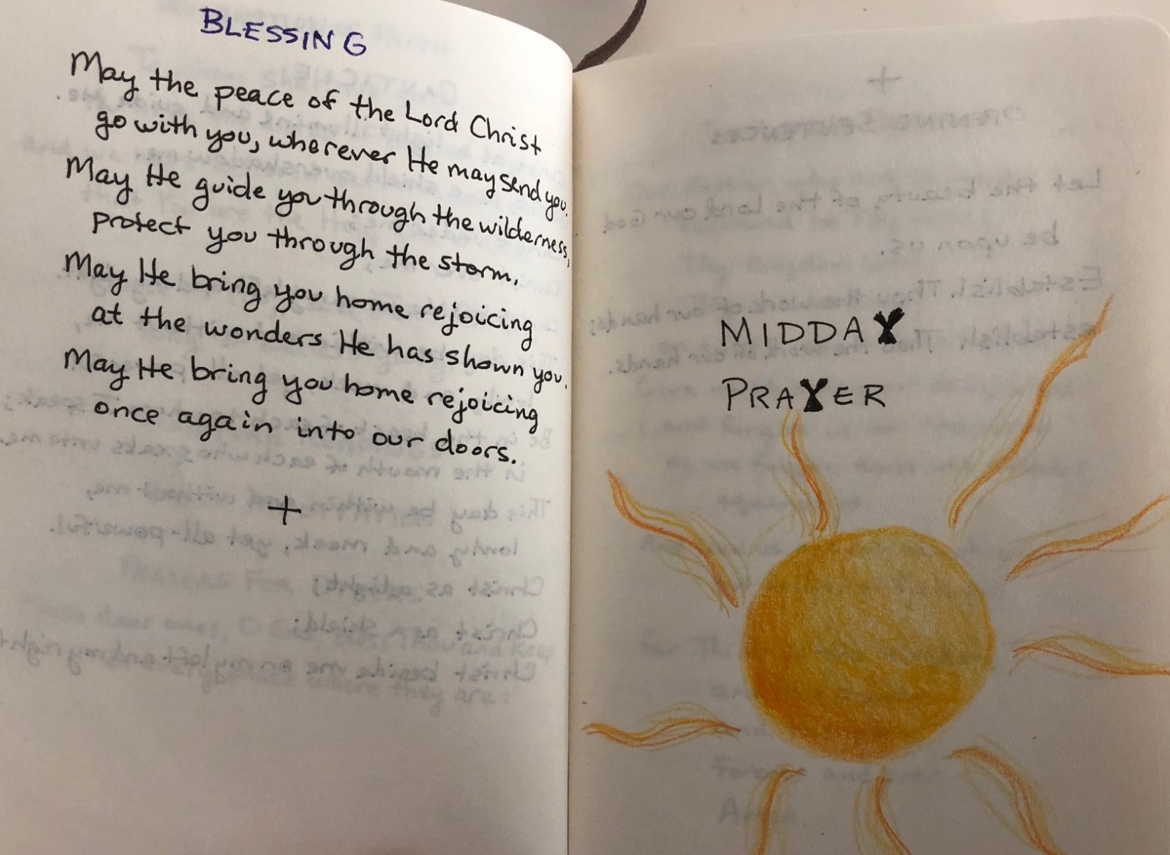 More recently, I customized the daily meditation and Scripture reading sections from Celtic Daily Prayer, but basically, I just compiled a bunch of stuff and sifted through it and copied it all down in a black Moleskine. I used it for about a year and then I lost it, and only afterward did I realize that I never made a copy. So I started over. I resifted everything and re-copied it into a grey pocket-sized Moleskine notebook — the unlined kind, as I’m not a fan of lined paper. Then, after my friend Amy Jo taught me how to quick-draw vines on a page, I added vines and a few other artistic elements to the cover and inside pages. (I watched a YouTube video to learn how to draw a loaf of bread, and I’m particularly proud of it.) I’ve since created a newer version in a thicker black, soft-cover Moleskine, and I’m still adding stuff to it. Here are a few snapshots of what it looks like: