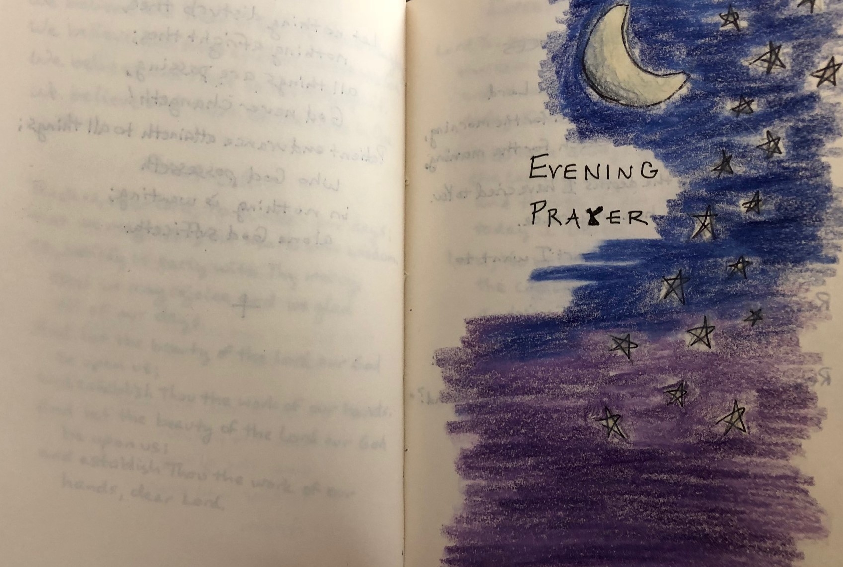 More recently, I customized the daily meditation and Scripture reading sections from Celtic Daily Prayer, but basically, I just compiled a bunch of stuff and sifted through it and copied it all down in a black Moleskine. I used it for about a year and then I lost it, and only afterward did I realize that I never made a copy. So I started over. I resifted everything and re-copied it into a grey pocket-sized Moleskine notebook — the unlined kind, as I’m not a fan of lined paper. Then, after my friend Amy Jo taught me how to quick-draw vines on a page, I added vines and a few other artistic elements to the cover and inside pages. (I watched a YouTube video to learn how to draw a loaf of bread, and I’m particularly proud of it.) I’ve since created a newer version in a thicker black, soft-cover Moleskine, and I’m still adding stuff to it. Here are a few snapshots of what it looks like: